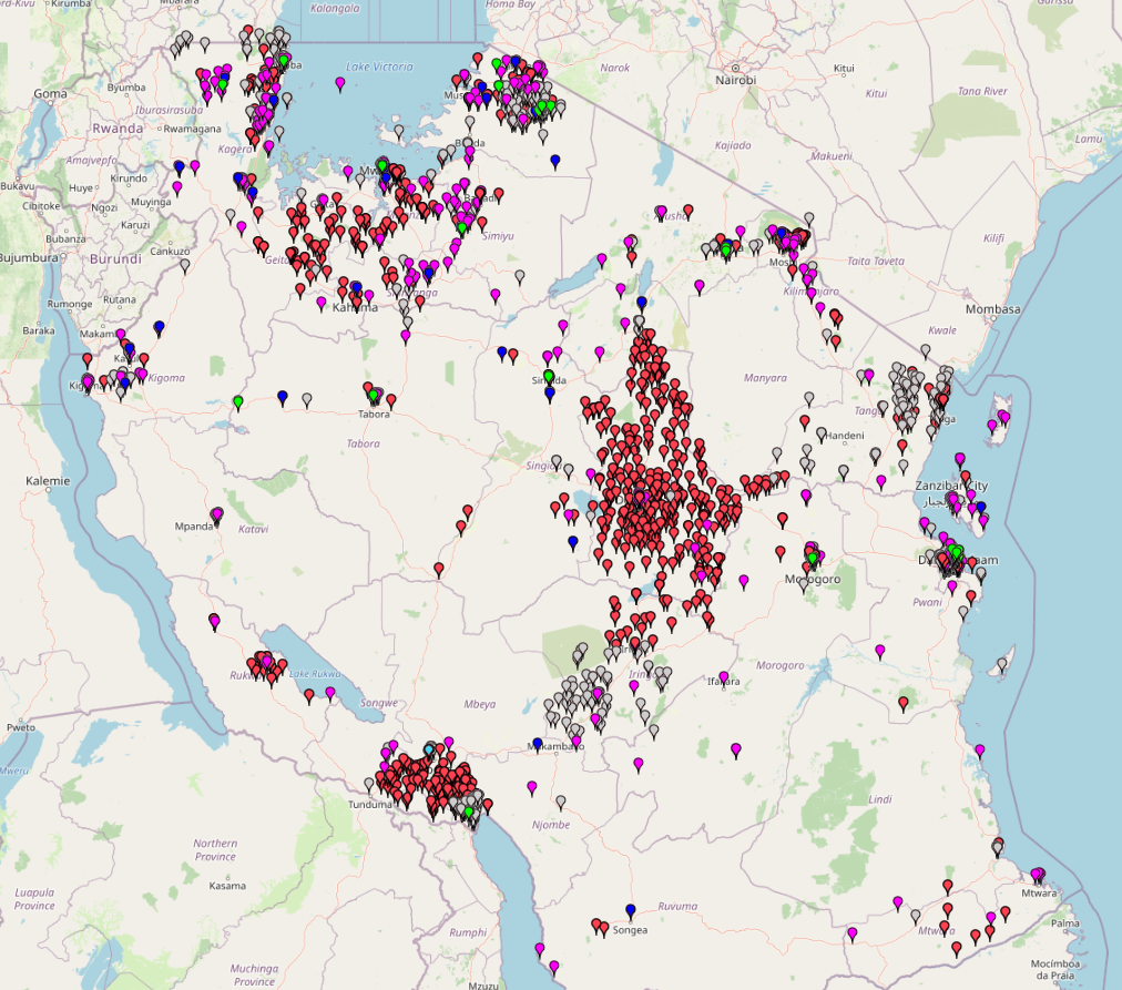This map presents the distribution of health care facilities across Tanzania, categorized into clinics, dentists, doctors, hospitals, pharmacies, and traditional practitioners. Clinics and pharmacies make up the majority, reflecting their