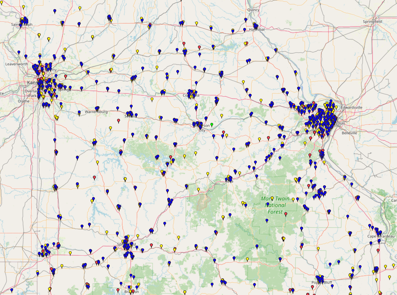 This map depicts the distribution of rural health care facilities across Missouri and neighboring states. It provides a spatial overview of healthcare infrastructure in rural areas, revealing both concentrated care