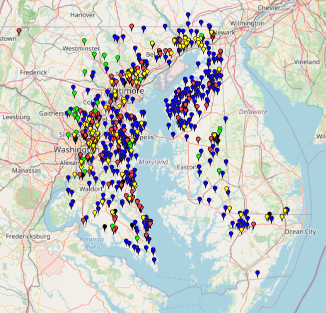 This map shows the Fish Blockage Locations around the Chesapeake Watershed. The categories are divided into four types of fish blockages: Dam, Culvert, Weir, and others. Data without latitude and longitude